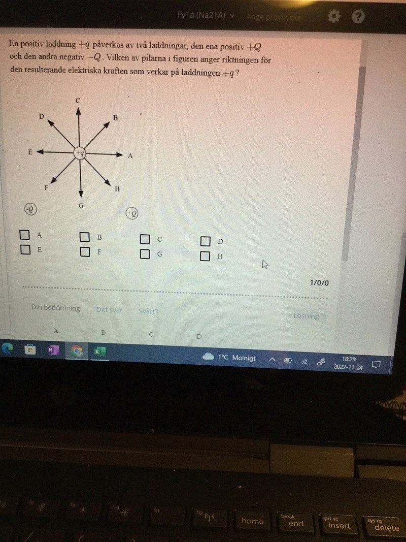 Varför är svaret E på denna frågan? Jag tänker att laddningen +q borde gå åt F pga att den attraheras till den negativa laddningen -Q.