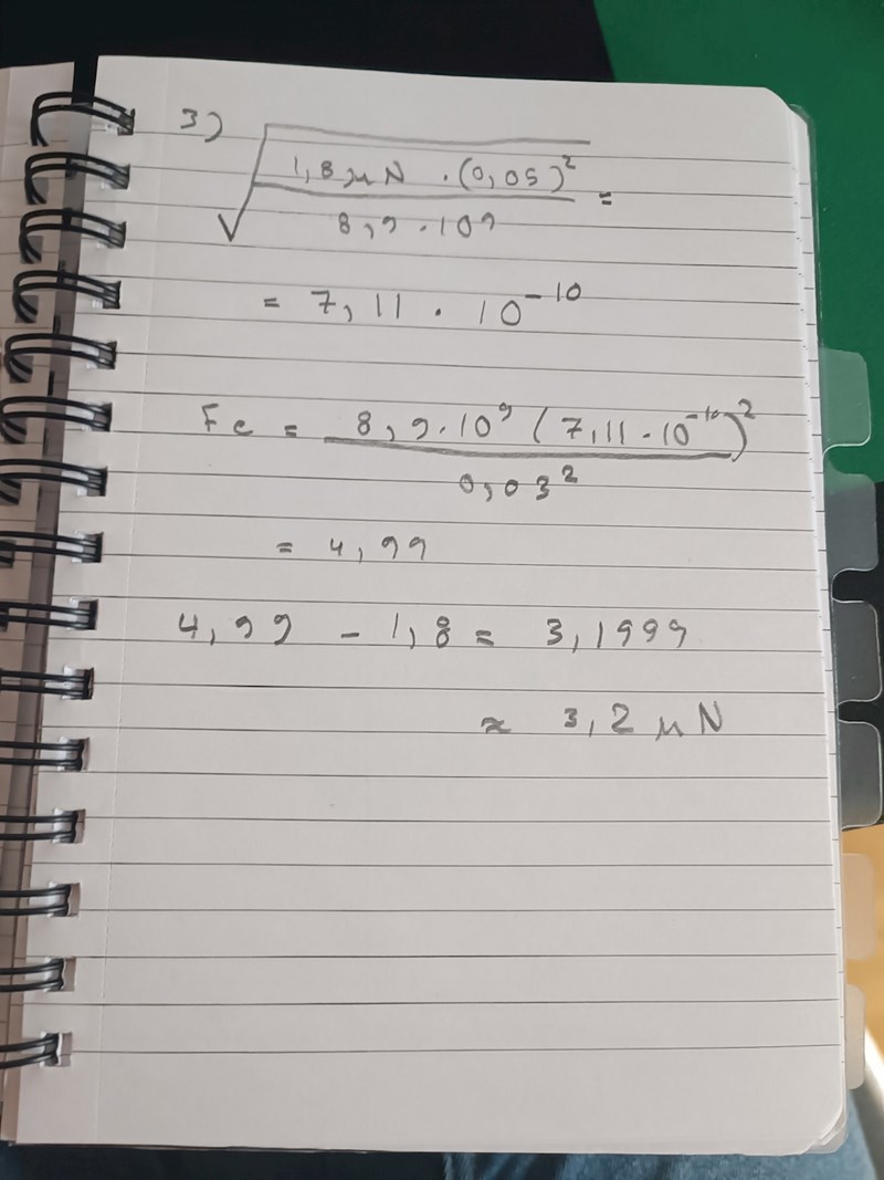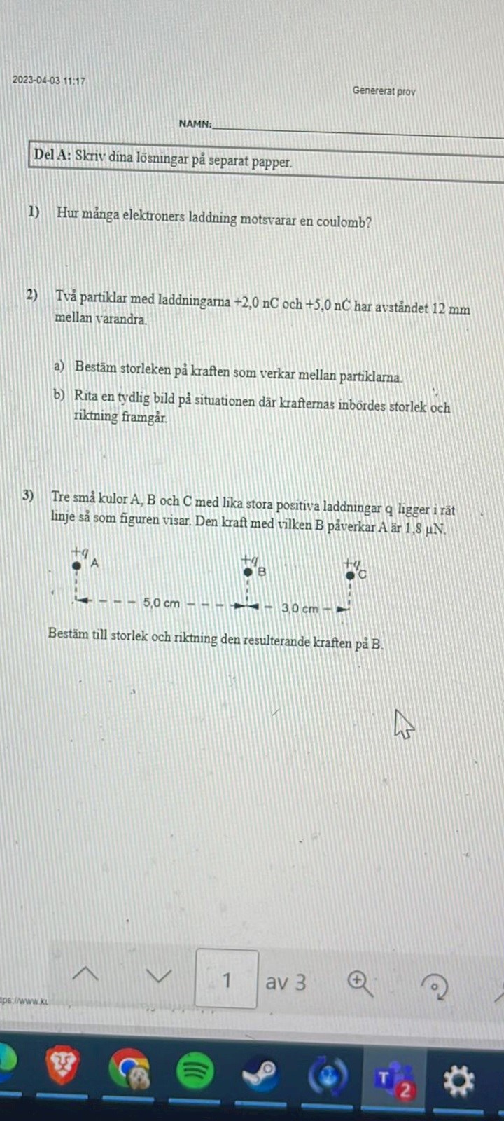 Tre små kulor A,B och C med lika stora positiva laddningar q ligger i rät linje så som figuren visar.Den kraft med vilken B påverkar A är 1,8*10^-6N.