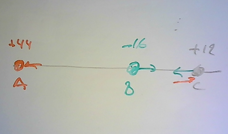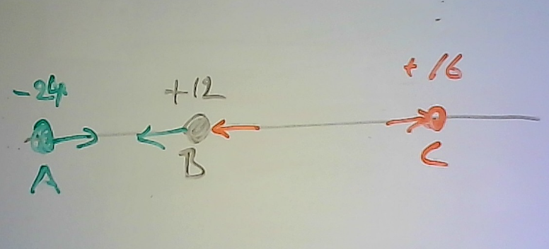 Där de röda pilarna är krafter som uppstår mellan B och C (dom repellerar varandra)
