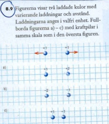 jag utgick från samma skala och t.ex på a) blev det 4 rutor åt höger för +2 och 2 rutor åt vänster för +1 men det blev fel och a och b var samma trots att det finns olika laddningar. Jag räknade även med medelvärdet av krafterna t.ex (1+2)/1.5 men det var också fel speciellt för c