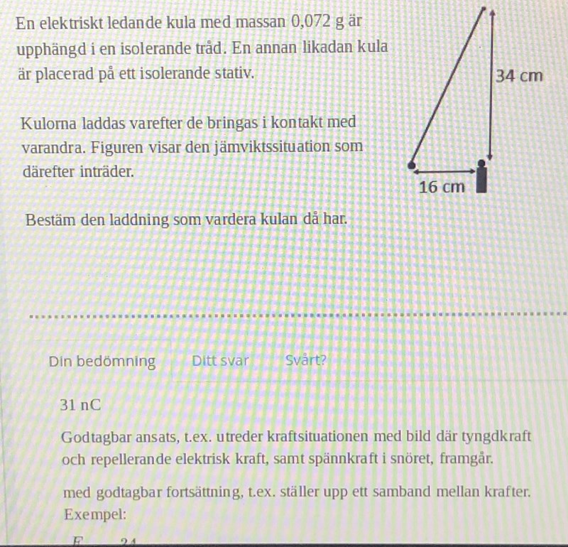Men det är bra att göra den noggrann, så att snörets vinkel stämmer och att kraftpilarnas längder är skalenliga. Rita också kraftparallellogram för att addera krafter, och för att räkna ut hur stor Coulombkraften blir.
