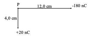 En kula P med laddningen -30 nC befinner sig 12,0 cm från en laddning –180 nC och på avståndet 4,0 cm från en laddning +20 nC. Riktningarna från P till laddningarna är vinkelräta mot varandra. Se figur.