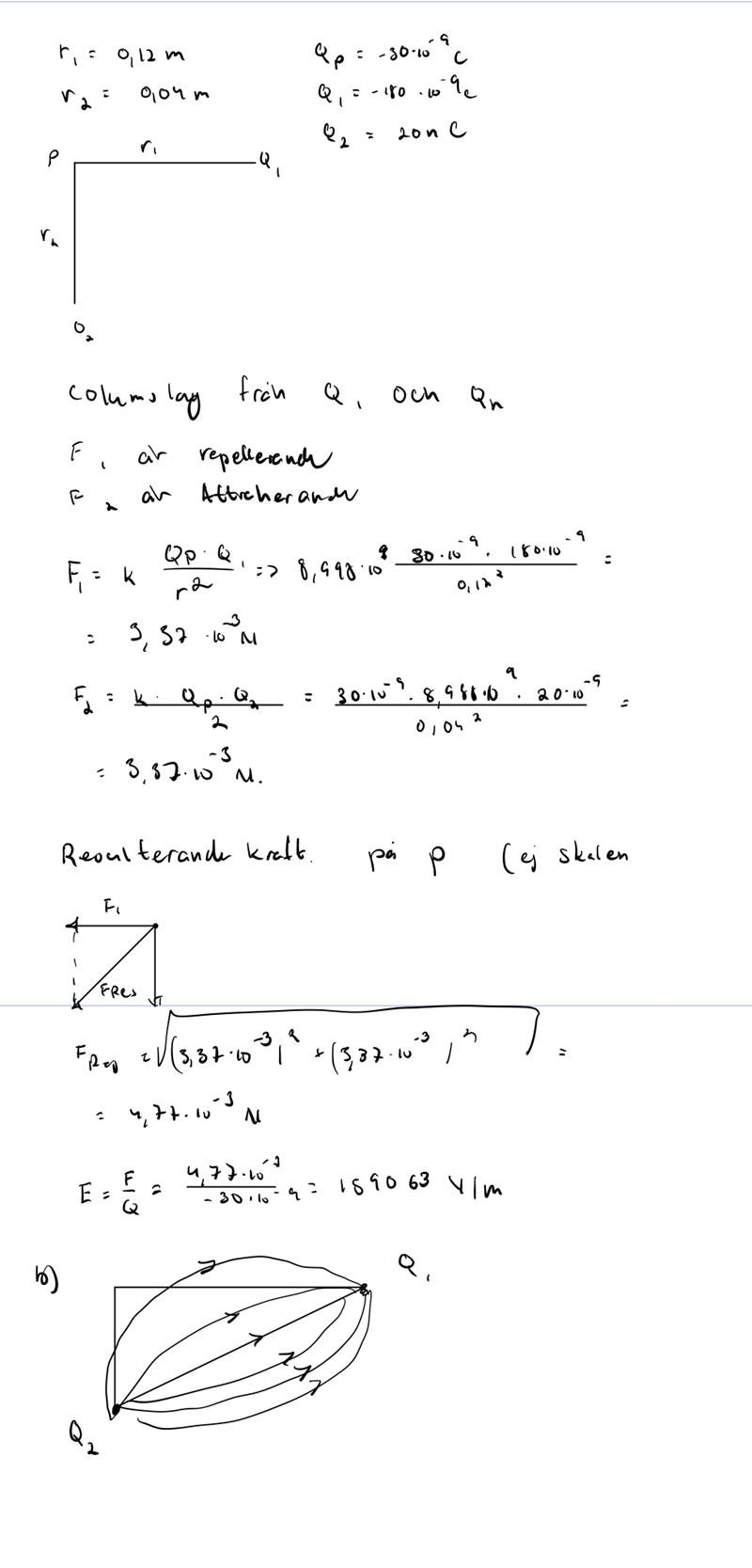 b) Här har du sannolikt missförstått vad Bo-Erik menade. Du ska i punkten där kulan P befinner sig rita in det elektriska fältets riktning. En endaste pil ska du alltså rita, i den punkten.