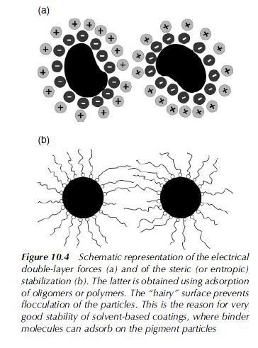 Då dessa positiva laddningar omsluter partikeln får bägge partiklar samma elektrostatiska laddning, och vill därför inte vill interagera med varandra. Därmed repelleras dessa partiklar.