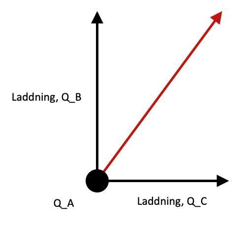 Avståndet till de andra punkterna är lika stort. Det innebär att vi, när vi bestämmer riktningen, inte behöver ta hänsyn till avstånden mellan punkterna. Vi provar att placera laddningarna från Q_C och Q_B så att de utgår från Q_A: