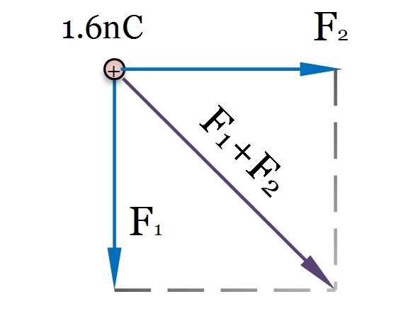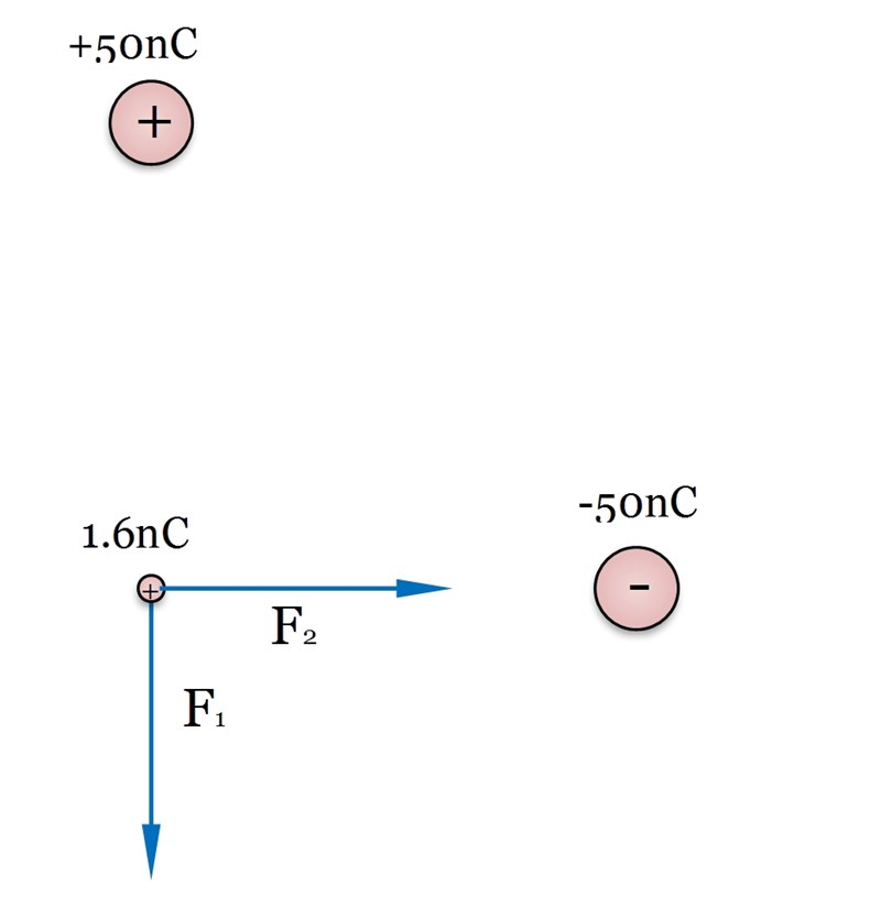Kraften från den negativa laddningen -50nC till höger drar laddningen 1.6nC åt höger eftersom en negativ laddning och en positiv laddning attraherar varandra. Jag kallar denna kraft .