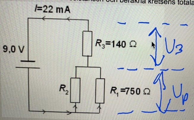 Vi kallar spänningen Up på de parallellkopplade (R1 och R2).