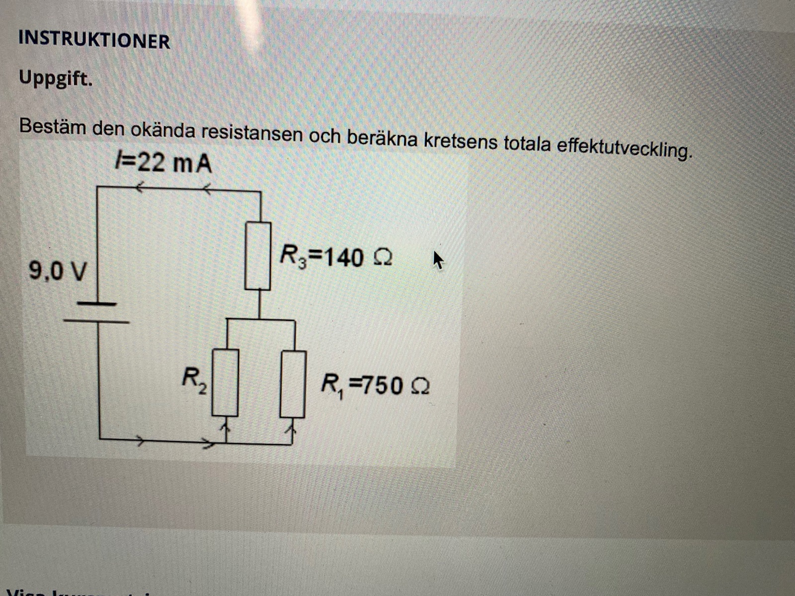 I=22mA =0,022AR3 =140ohm Spänning U3 över R3 är okänd.