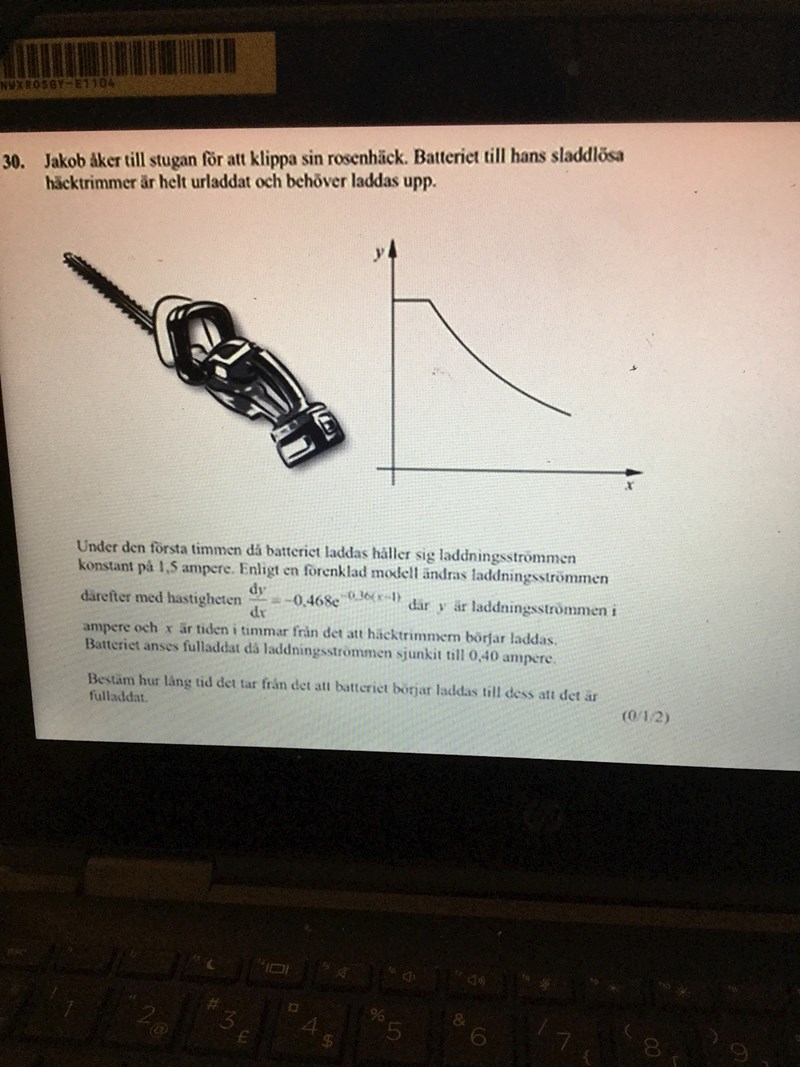 Det räcker att du (1) integrerar dy/dx och får fram dess primitiva funktion f(x) (funktionen som grafen beskriver) (2) sätter f(x) = 0,4 (3) löser ut x och adderar 1 till x eftersom vi måste räkna med timmen då den strömmen var konstant, se start på graf