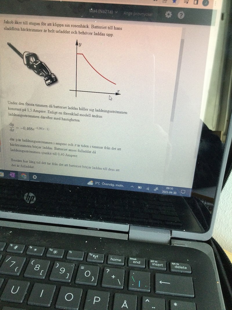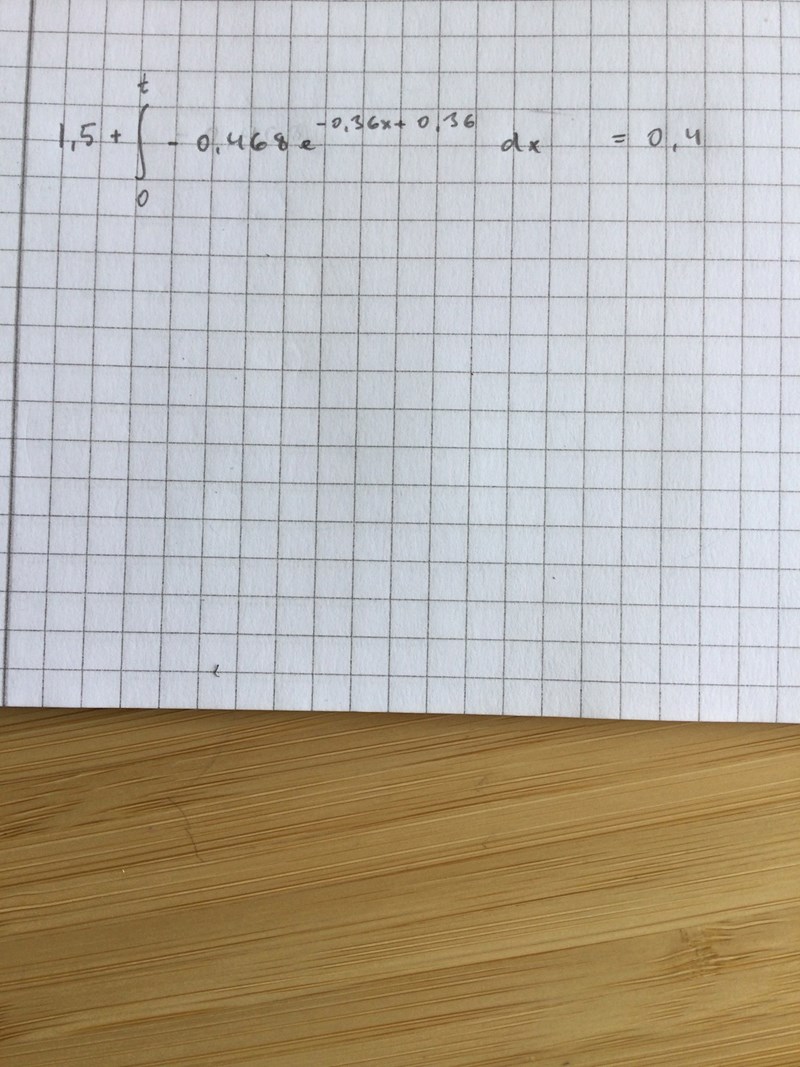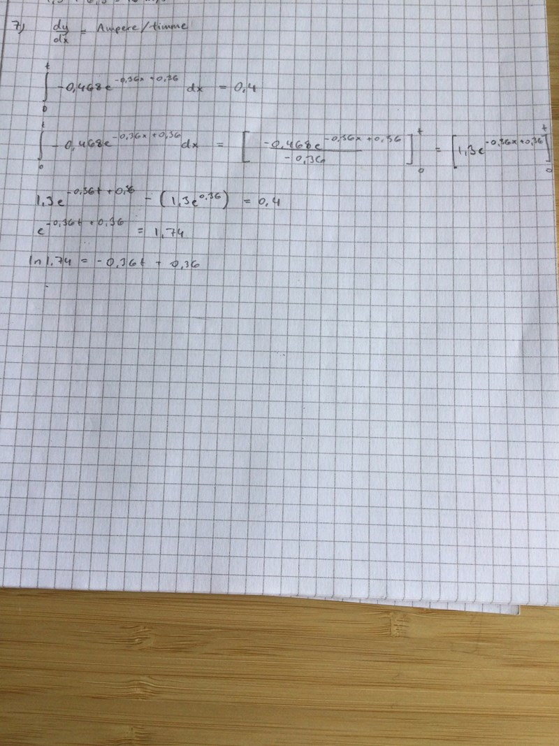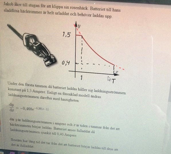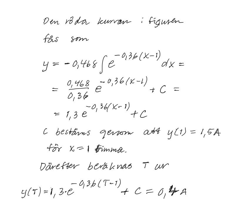 Jag får negativt värde på tiden men jag tror min uträkning är rätt. Det jag gjorde var att jag skrev upp en integral som ska vara lika med 0,4 ampere. Den givna funktionen i uppgiften beskriver hastigheten som strömmen ändras på så för att man ska veta vilken ström vi har efter en viss tid kan man beräkna integralen. Detta eftersom arean under funktionen ger strömmens storlek.