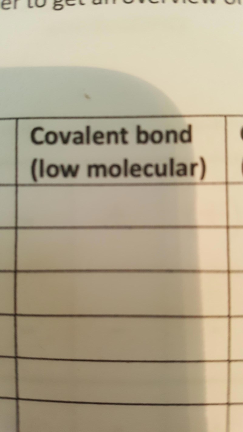 Jag har aldrig tidigare hört talas om "lågmolekylära kovalenta bindningar, respektive högmolekylära kovalenta bindningar". Högmolekylära ämnen, ja, men inte högmolekylära bindningar. Kan du lägga in en bild av texten där det står?