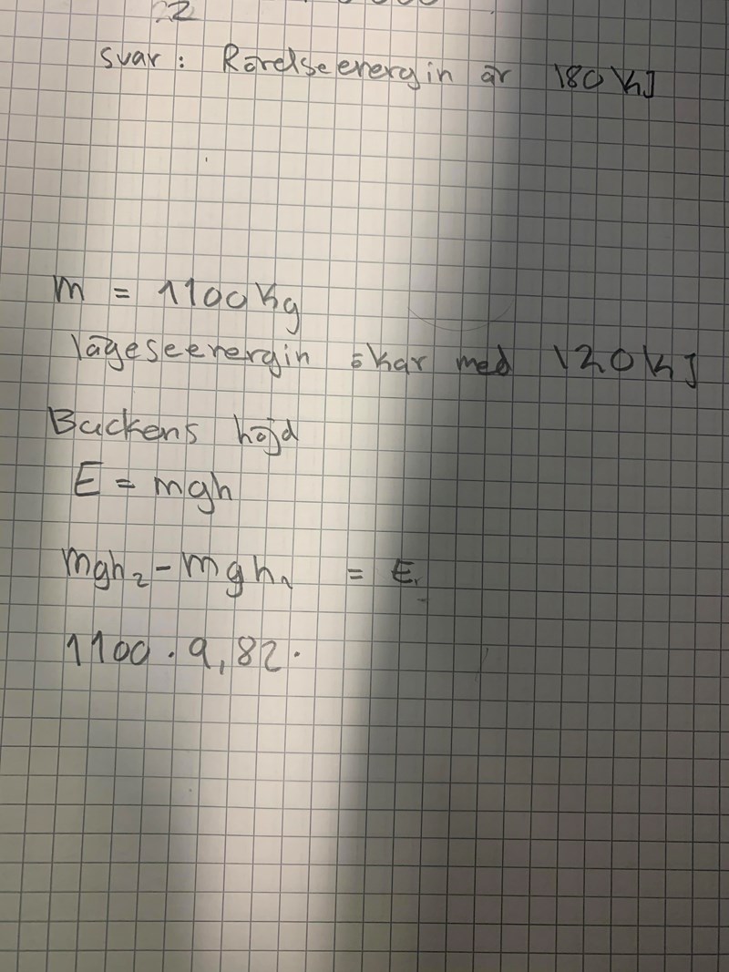 Backens höjd är h (m). Vi vet att bilens massa är 1 100 kg och att g = 9,82 N/kg.