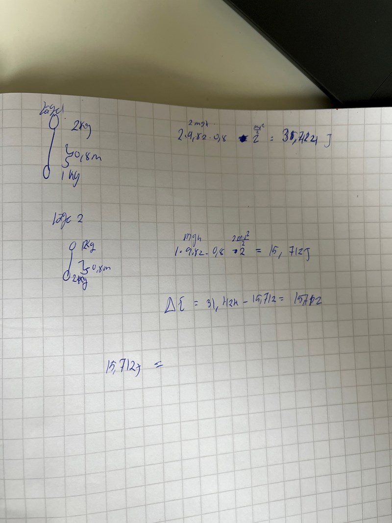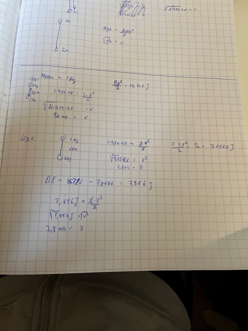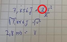 Nej, men när du räknar ut farten har du skillnaden i potentiell energi som du sätter = mv^2/2. Vad är m där? Hur stor massa har du satt i rörelse?