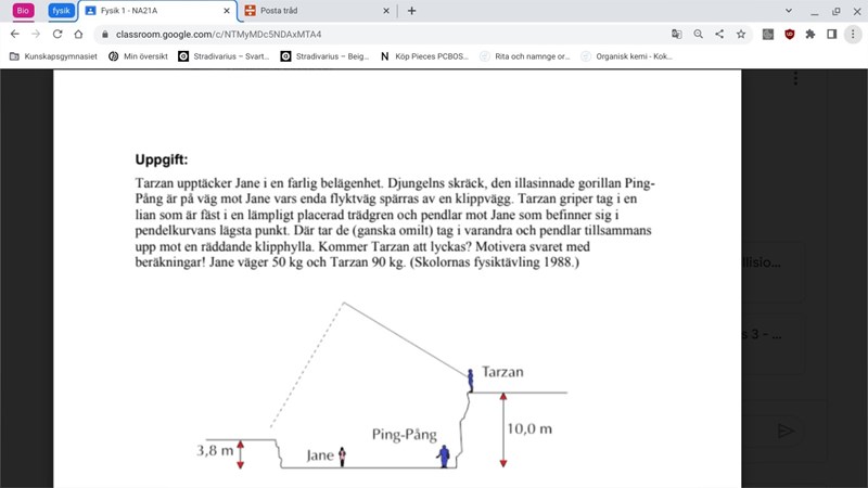 Ja, hastigheten direkt efter han och Jane gripit tag i varandra (efter den oelastiska stöten) ger tillsammans med den sammanlagda massan rörelseenergin. Den rörelseenergin omvandlas till lägesenergi då de rör sig uppåt. När de stannar har all rörelseenergi omvandlats till lägesenergi.