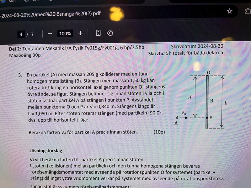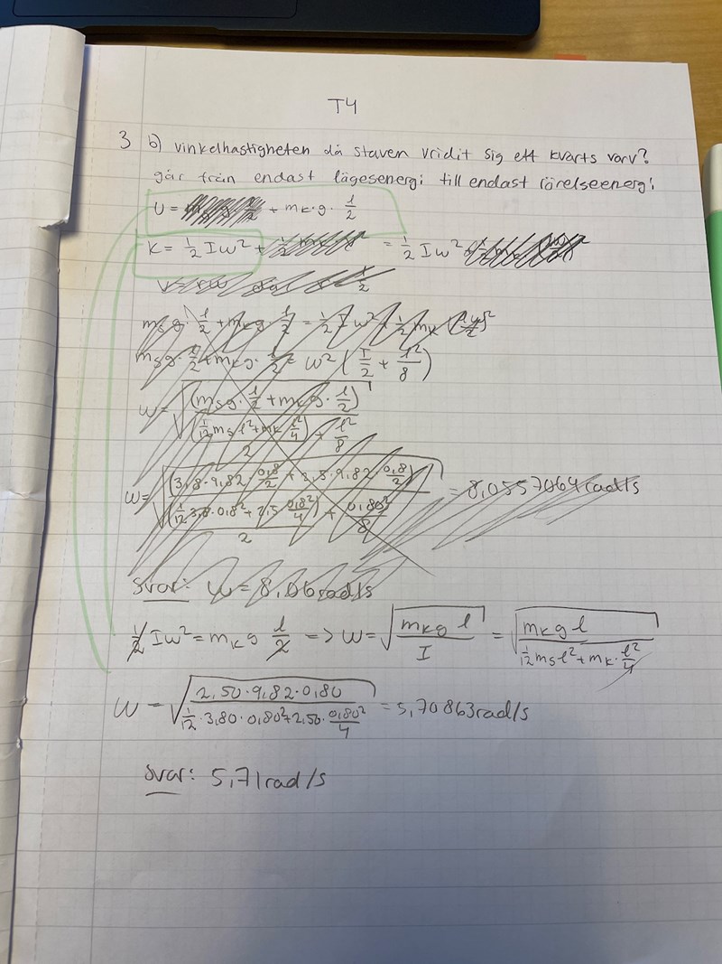 Hej jag har två olika men ändå lite lika uppgifter I första uppgiften var lägesenergin för stång+partikel uppdelade till U=mBg*(L/2)+mAgd där första är stång och andra partikel. Medan i andra uppgiften är lägesenergin endast ”partikel” (i detta fall en boll). Varför ska man inte ha med lägesenergin för stången också? Jag tänkte alltså att det skulle vara U=msg(L/2)+mkg(L/2) men det ska endast vara U=mkg(L/2). Varför är det olika och hur vet man när man ska ha båda och inte?