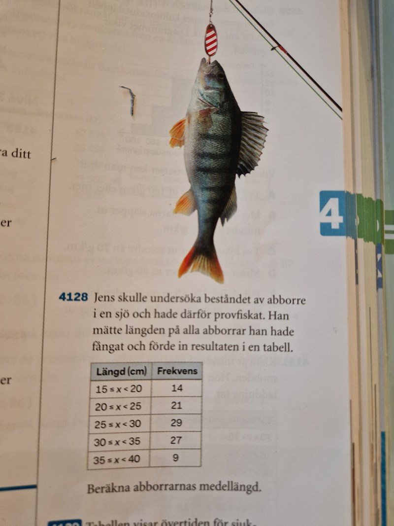 Du har valt det övre värdet i varje intervall. En del av fiskarna i intervallet mellan 15 och 20 cm var troligen kortare än 20 cm. Man brukar räkna med ett värde i mitten av intervallet istället.