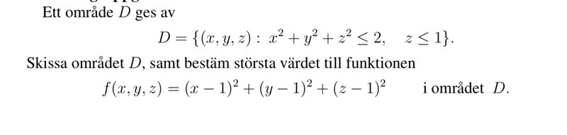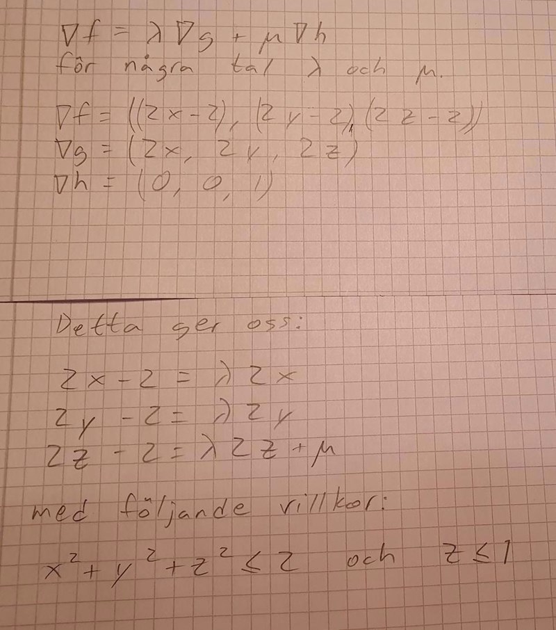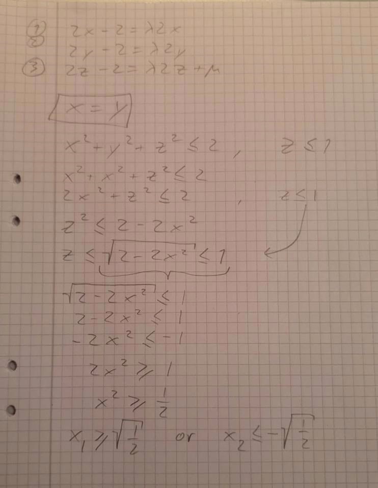 miccelina skrev:jag tänker att man får sambandet x=y från determinanten, sen löser man ekk.systemet x=y, z=1, x^2+y^2+z^2=2 men jag kan ha helt fel, tycker uppgiften är svår.