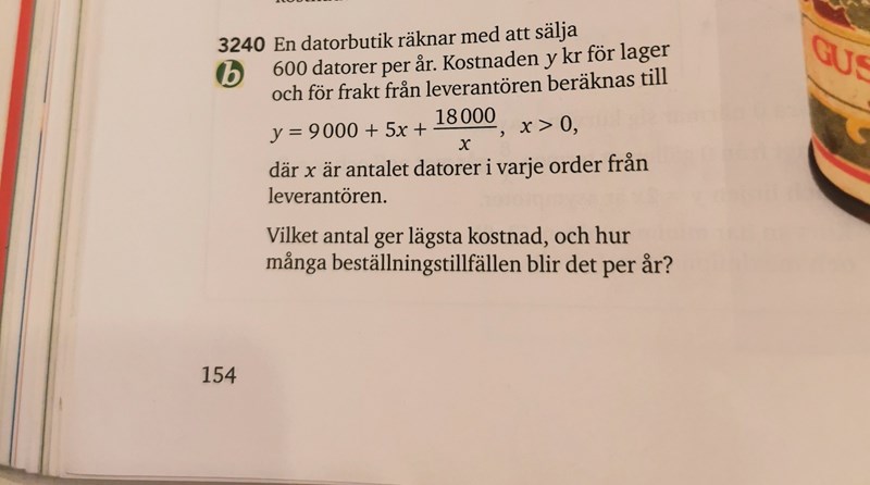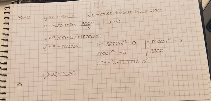 Jag vet inte riktigt hur jag ska börja räkna ut detta. Jag deriverade först funktionen och tänkte se vilket värde x har när y'=0 för att få fram ev nollställe (som visar lägst kostnad, en minimipunkt) men kommer inte vidare.