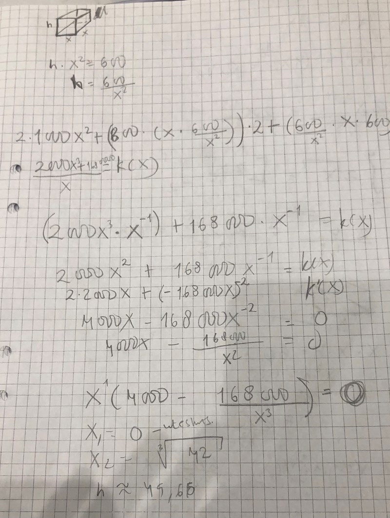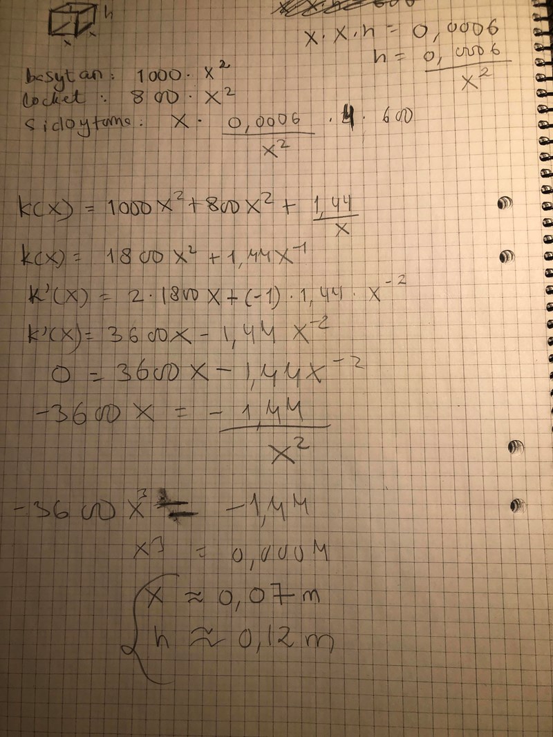 Ett företag ska tillverka 100 000 små lådor med volymen 600cm3. Lådorna ska ha formen av ett rätblock med kvadratisk basyta. Materialet till basytorna kostar 1000kr/m2, till sidoytorna 600kr/m2 och till locken 800kr/m2. Vilka är de måtten som ger lägsta möjliga materialkostnad?"
