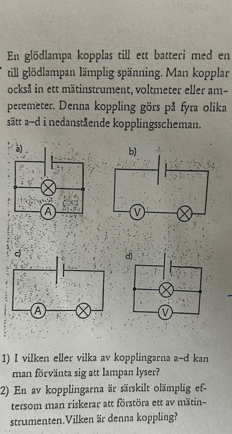 Då ser det rätt ut i c) och i d) för där sitter amperemetern i en seriekoppling och i d) sitter voltmetern i en parallellkoppling, då lyser de bra och inte för starkt.