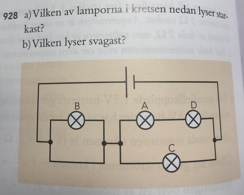 Fråga b) hur kan svaret vara att B lyser svagas, det står till och med i facit att den inte lyser alls? Förstår verkligen inte det, det är ju med i första grenen där strömmen delar på sig först och borde ju lysa en av de starkare?