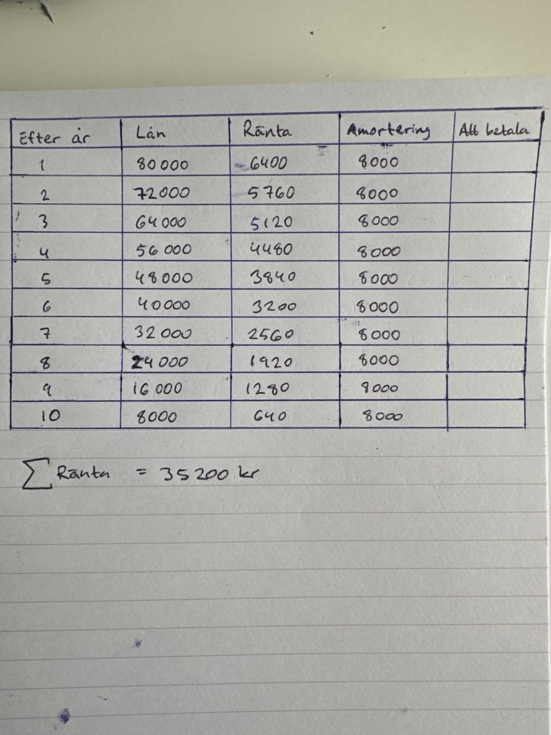 Jag har räknat ut hur mycket lånet kommer kosta honom genom att summera alla räntor på de 10 åren som han betalar ränta. Jag har fått rätt svar men min metod tog ganska lång tid. Kan man använda en färdig formel för geometrisk summa för denna uppgift? Isåfall hurdå?