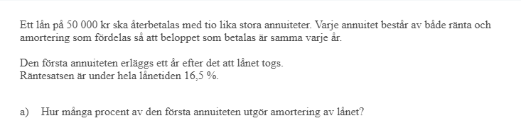 Uppgifter om annuitetslån och annuiteter återkommer år efter år.  I mitt första inlägg (#2) svarade jag att det är lite för komplicerat att gå igenom hela bakgrunden i ett vanligt inlägg. Man behöver vara bekant med en hel hop grundläggande ekonomiska begrepp, termer och samband  för att få ihop det. Egentligen är detta en ekonomiuppgift och ingen matteuppgift, men man översätter den till matematiska för att kunna lösa den.  Precis som man gör med fysikuppgifter.