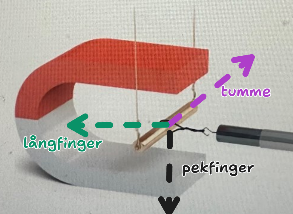 Magnetfältet går ner så min pekfinger måste peka nedåt. Kraften går åt höger, men min tumme pekar vänster