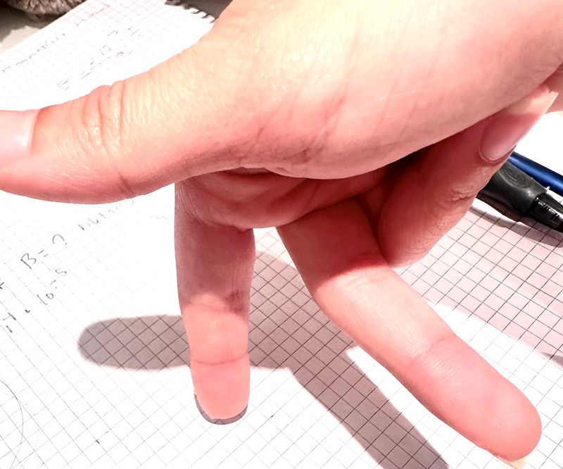 - Nu borde ditt långfinger peka in i magneten mot där det röda och vita möts.