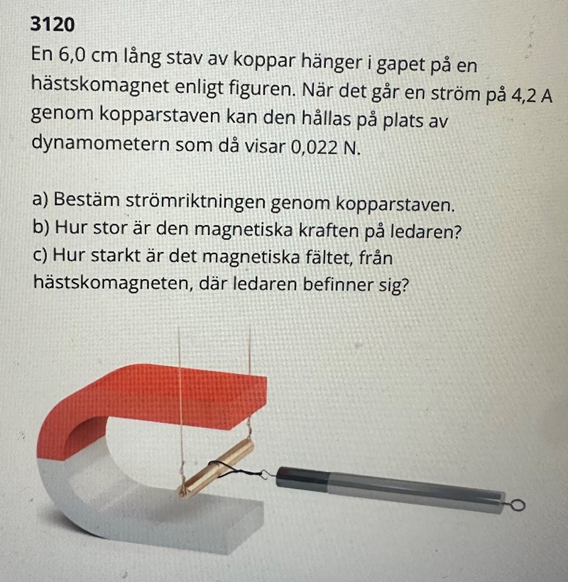 facit säger ”eftersom man måste dra staven åt höger med dynamometern för att hålla den på plats, förstår vi att den magnetiska kraften är riktad åt vänster. Magnetfältet är riktat från nord till syd, dvs rakt nedåt. Fingeregerlna visar att strömmen måste gå i riktning bort från läsaren genom staven”