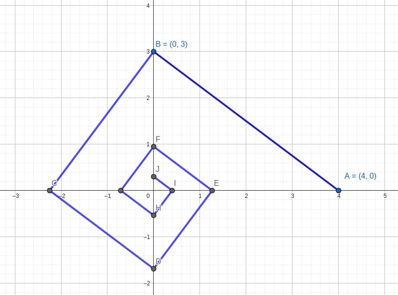 Spiralen i figuren går runt origo oändligt många gånger och alla vinklar i den är räta. Beräkna hur lång spiralen är.
