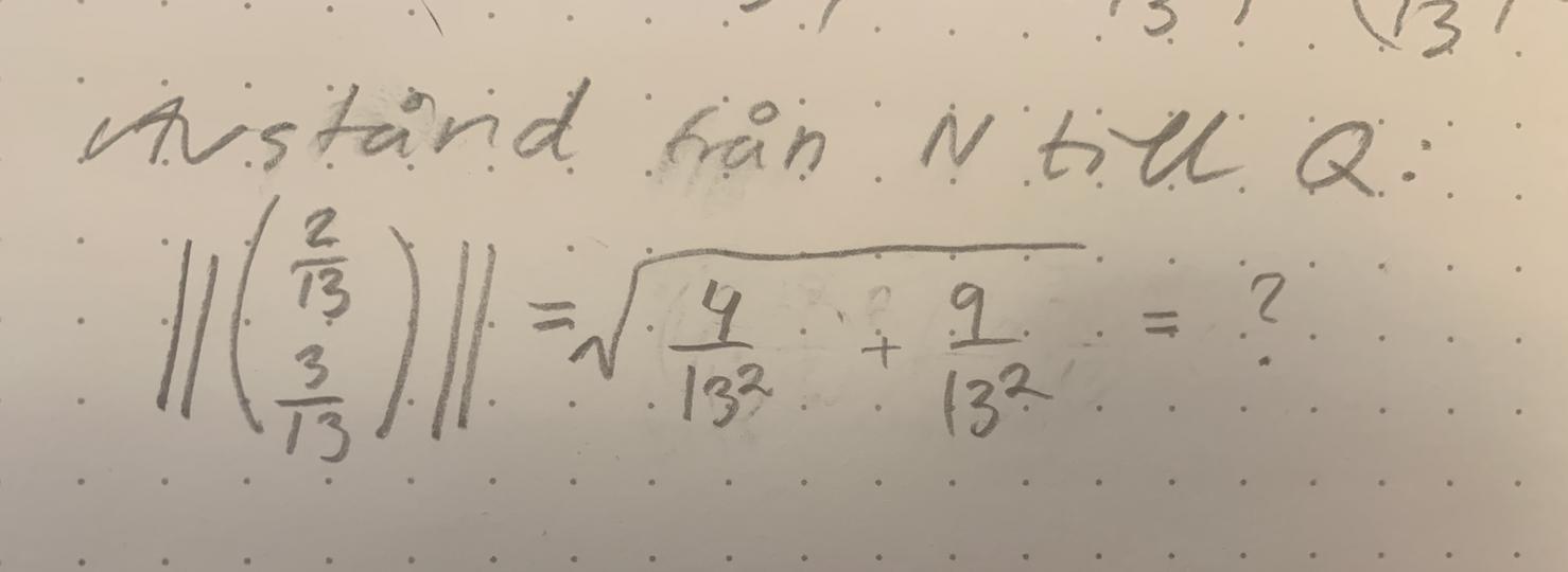 Jag ska beräkna längden av en vektor, vilket görs här m.h.a. pythagoras sats. Det jag fastnar på är själva uträkningen av sqrt((2/13)^2 + (3/13)^2).