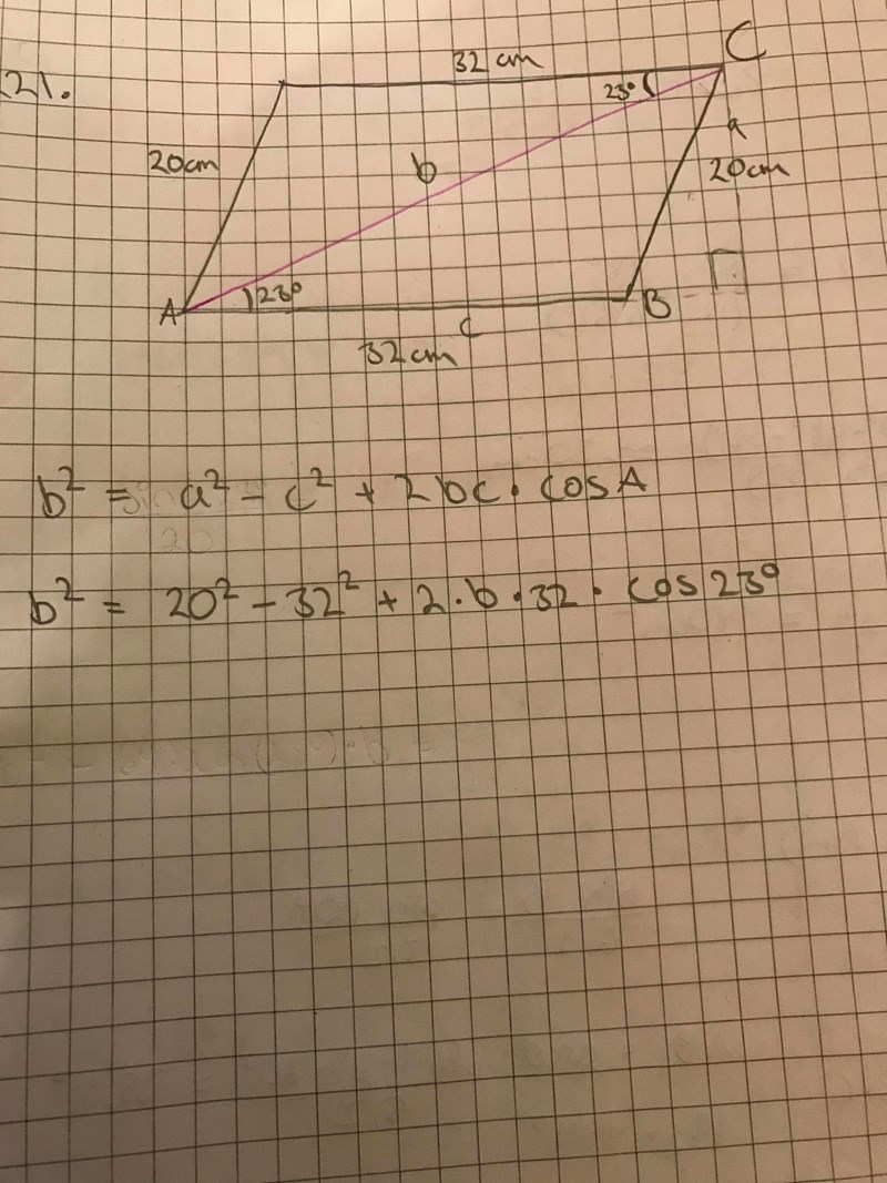 Den sidlängd som är kvadrerad till vänster om lilkhetstecknet ska vara den som är motstående vinkeln, dvs sidam med längden 20 cm i ditt fall.