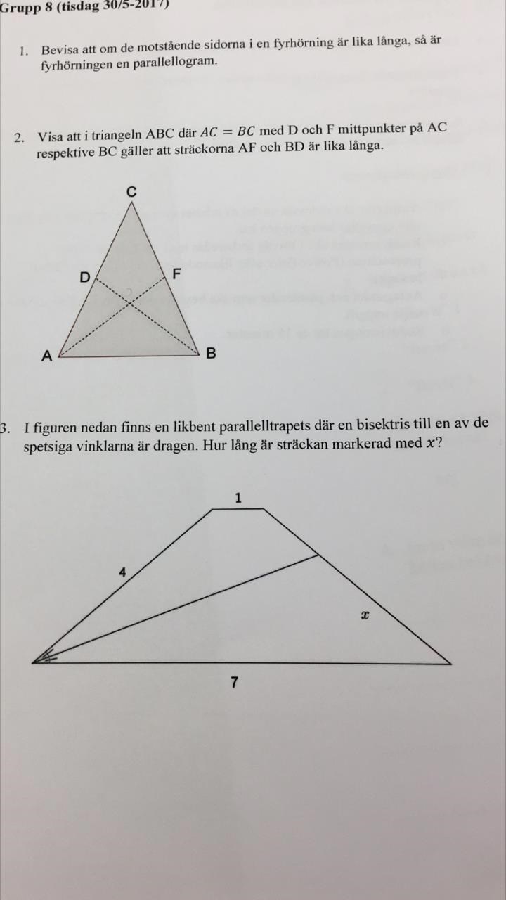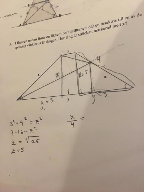 I figuren nedan finns en likbent parallelltrapets där en bisektris till en av de spetsiga vinklarna är dragen. Hur lång är sträckan markerad med x ?