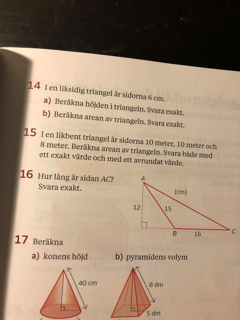 behöver hjälp med tal 16. Jag försökte räkna ut kateter 2 (basen) på den rätvinkliga triangeln och efter det addera det med den andra triangels bas (16cm) och från det har jag fått fram bas och höjd och från det är det bara simpel Pythagoras stats, men nej. Tydligen inte. Hur borde jag göra??