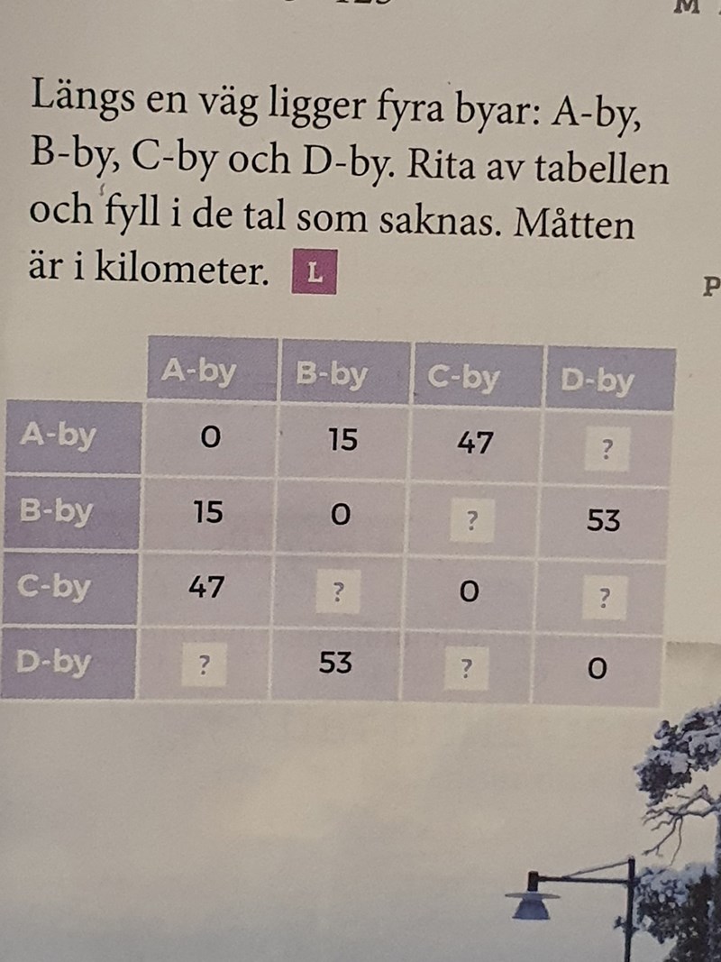 Längs en väg ligger fyra byar, fyll i det tal som saknas