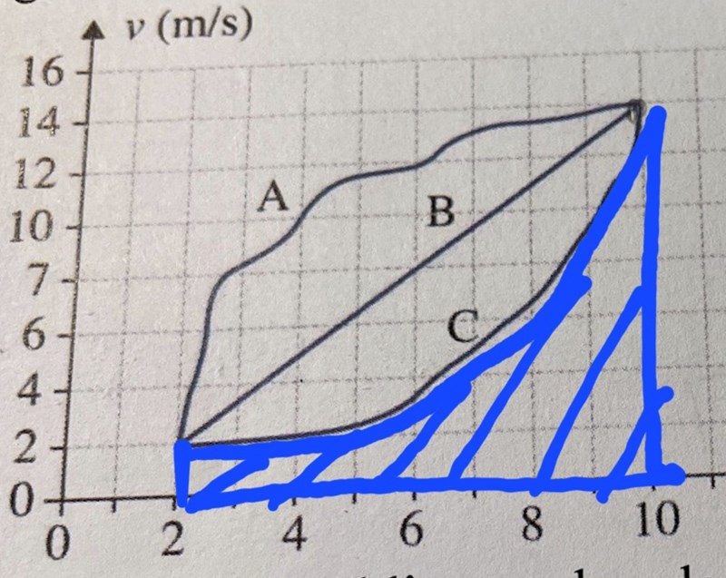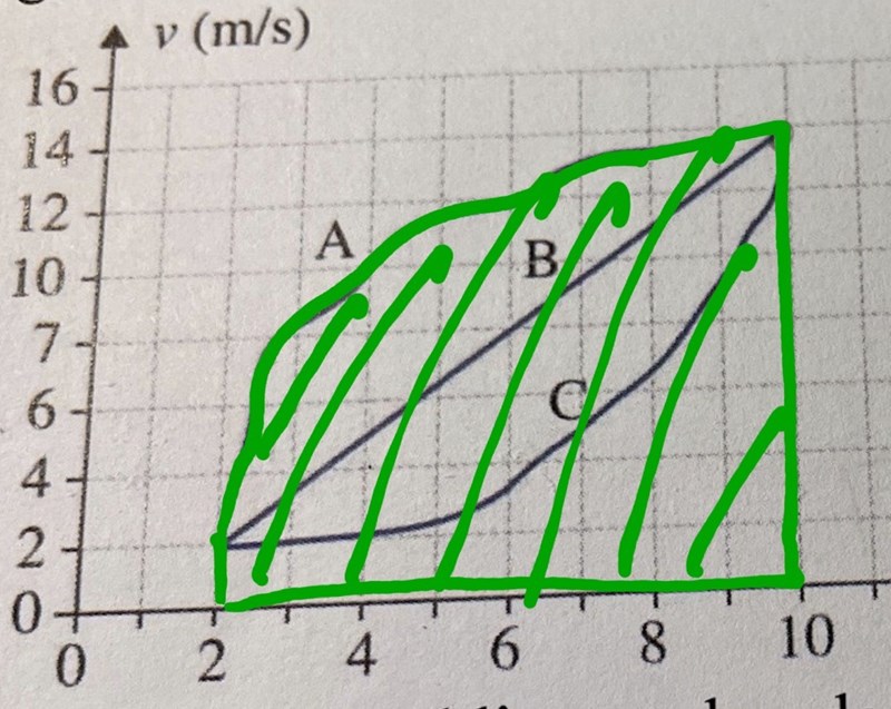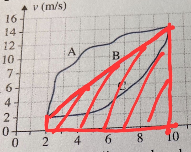 Jag förstår verkligen inte hur arean beräknas. Basen = 8s. Höjden = 12 m/s. Detta gäller, som jag ser det, för alla tre areor. Frågan kräver ingen uträkning, utan enbart svar; hur kan vem veta som färdas längst?