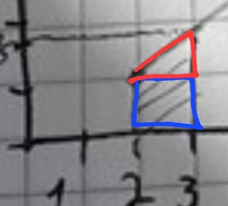 Området består av en rektangel (blå) med area 2•1 = 2 och en triangel (röd) med area 1•1,5/2 = 0,75.