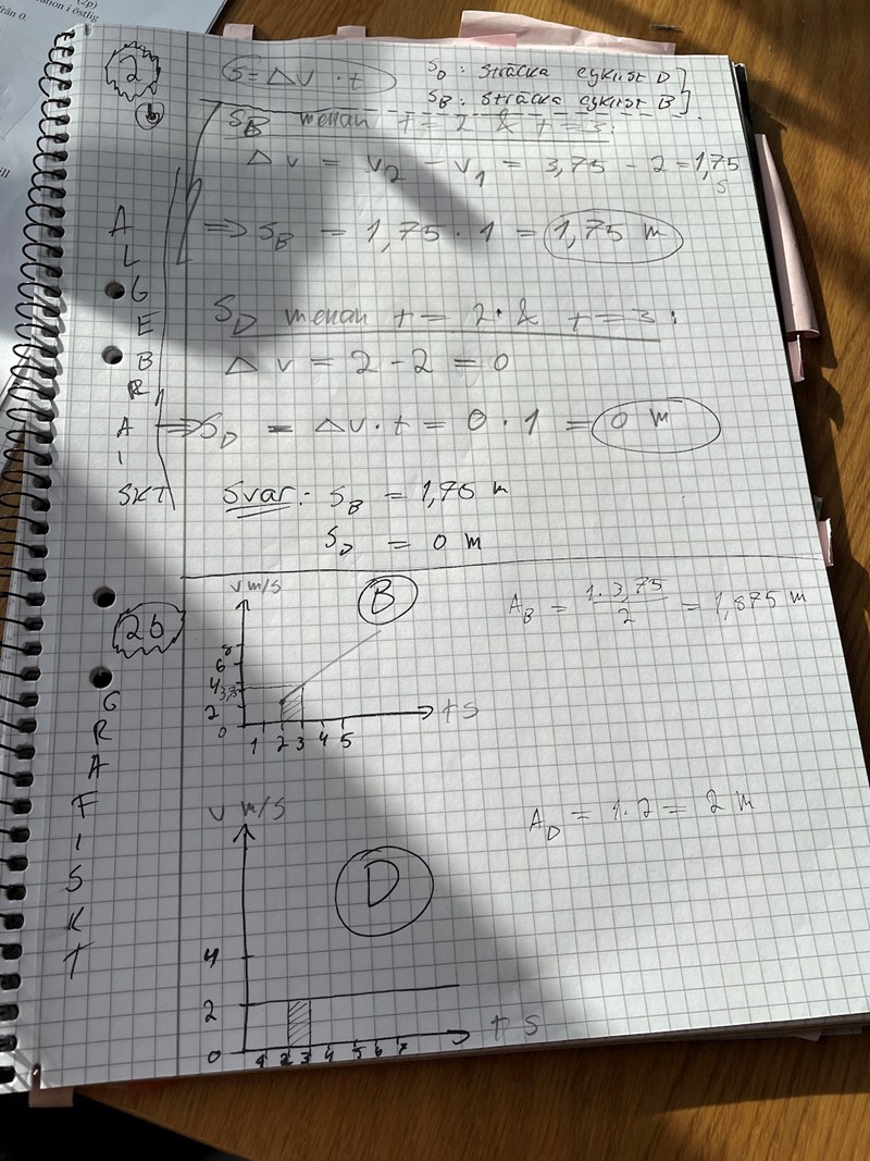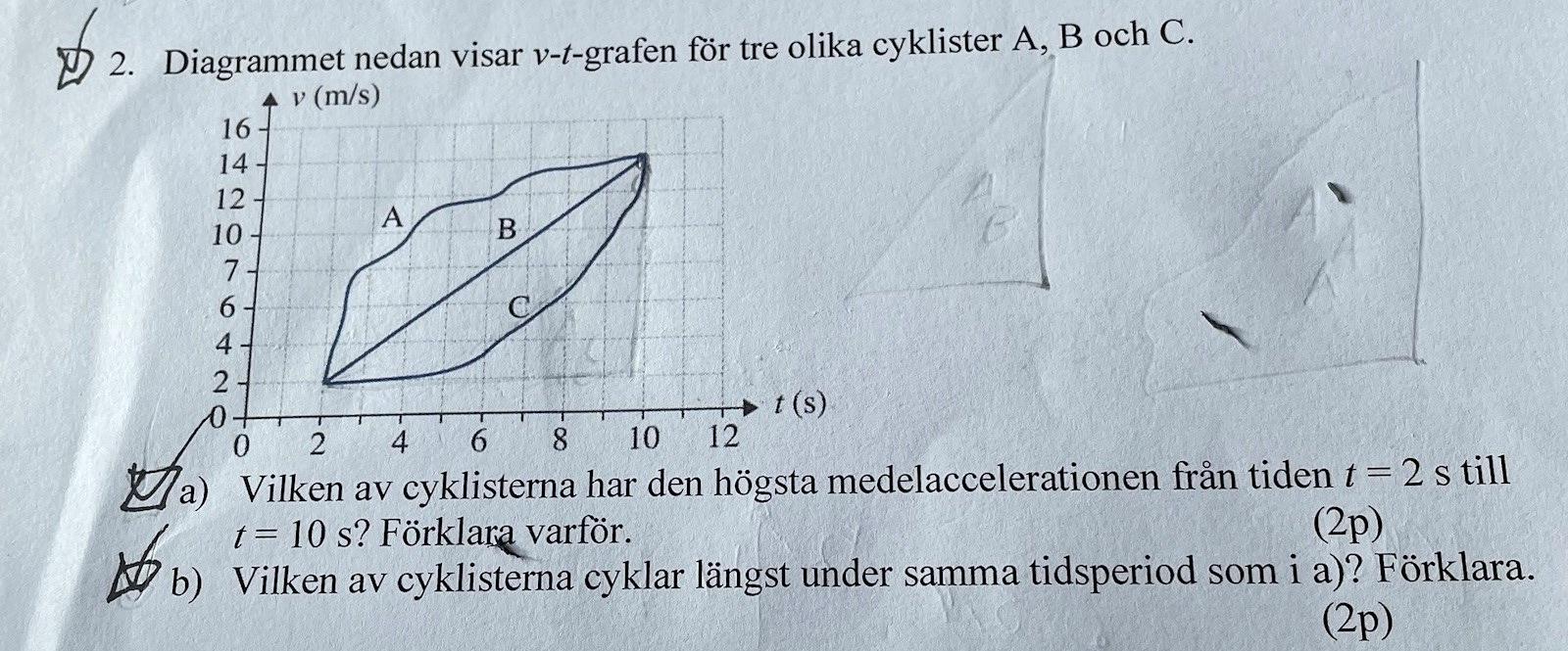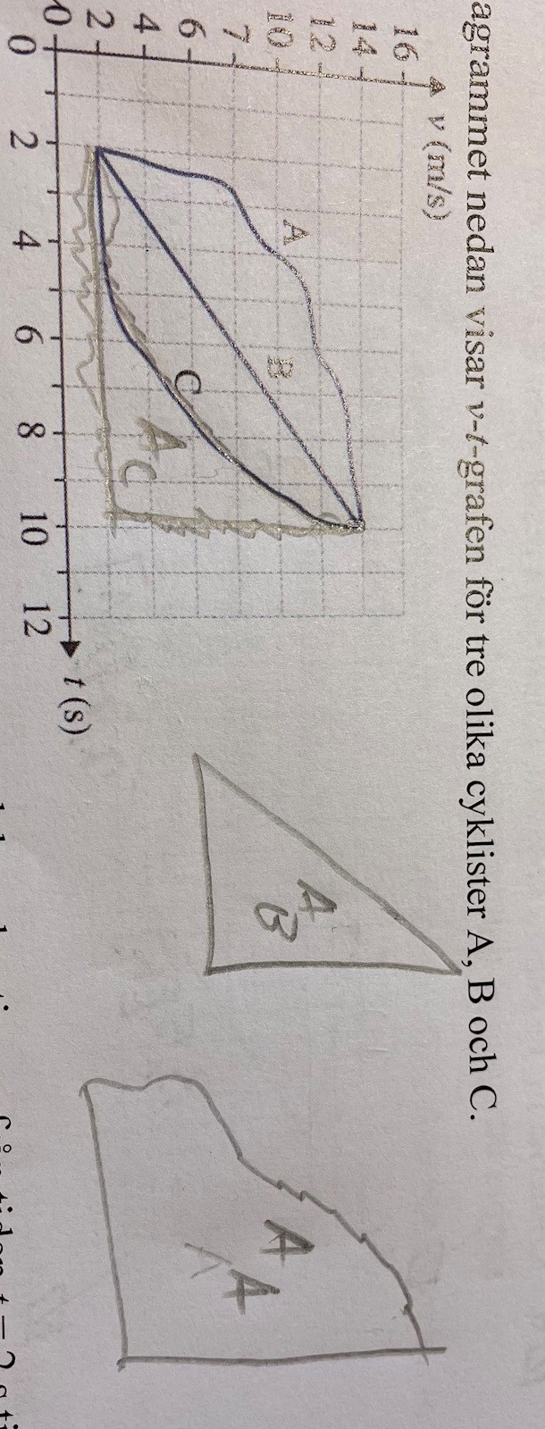 Nilsson skrev:Pieter Kuiper skrev:Grafen visar ju att cyklist A har högst hastighet hela mätperioden (kan vara i början av en tävling).