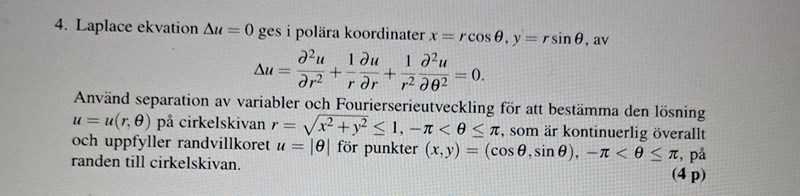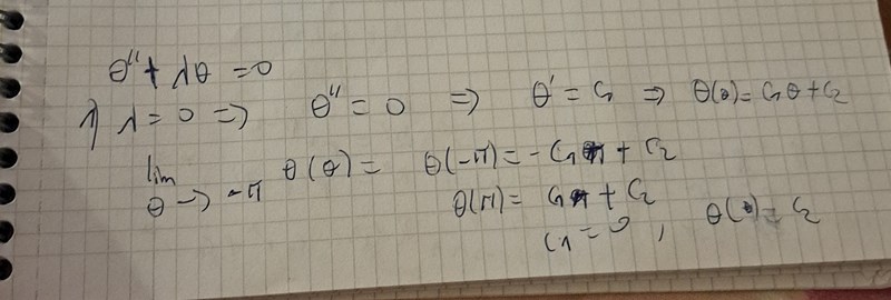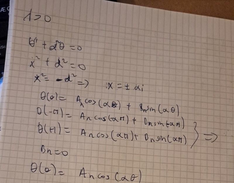 I fallet lambda=0 så fick jag theta(theta)=C1 och sen för randvillkor u(r,-pi)=u(r,pi) så fick jag att theta(theta)=Ancos(alfatheta) överlever men facit verkar inte ha tagit med lambda=0 lösningen för theta(theta) och sen formulerar de en lösning på theta(theta) där Bnsin(alfatheta) är med i den men jag strök den bort. Varför är den med?