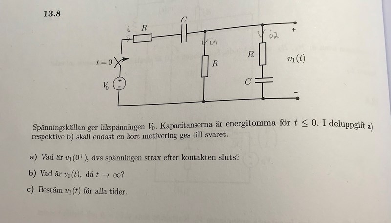 Det är c) jag har problem med. Jag vet inte riktigt hur jag ska ställa upp differentialekvationen innan jag transformerar den. Med kirchhoffs spänningslag får jag V0-Ri-Vc-v1(t) = 0 men det är för många obekanta. Tips?