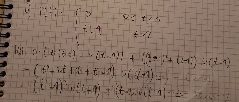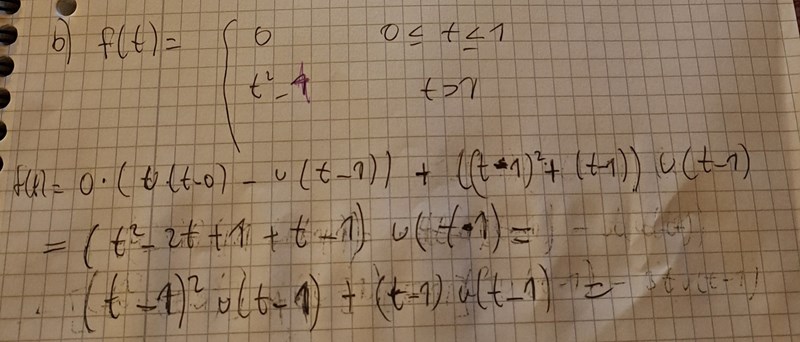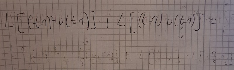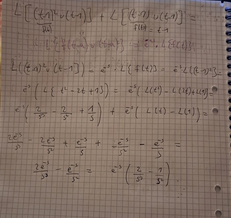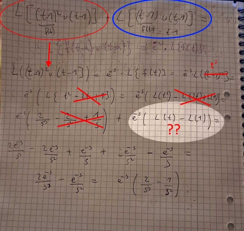 Det kanske är tydligare om jag visar hela min beräkning.  Det är alltså sista raden jag vill ta L på. Vi har ju e^-s*L[(t-1)^2] fån första termen när vi använder den där regeln och man kan ju utveckla så att vi har e^-sL[t^2-2t+1]. sen har vi e^-s(L[t^2]-2L[t]+L[1]) och sen gör vi likadant på andra termen L[(t-1)u(t-1)] och kikar på formelbladet. Det är så jag har gjort.