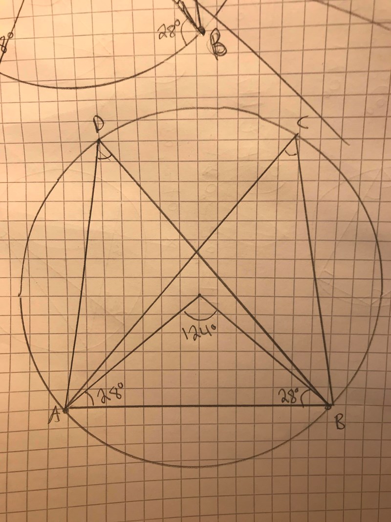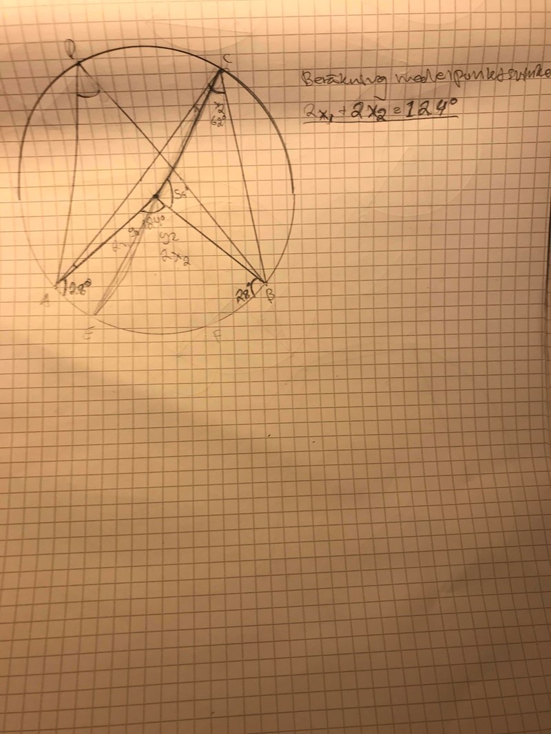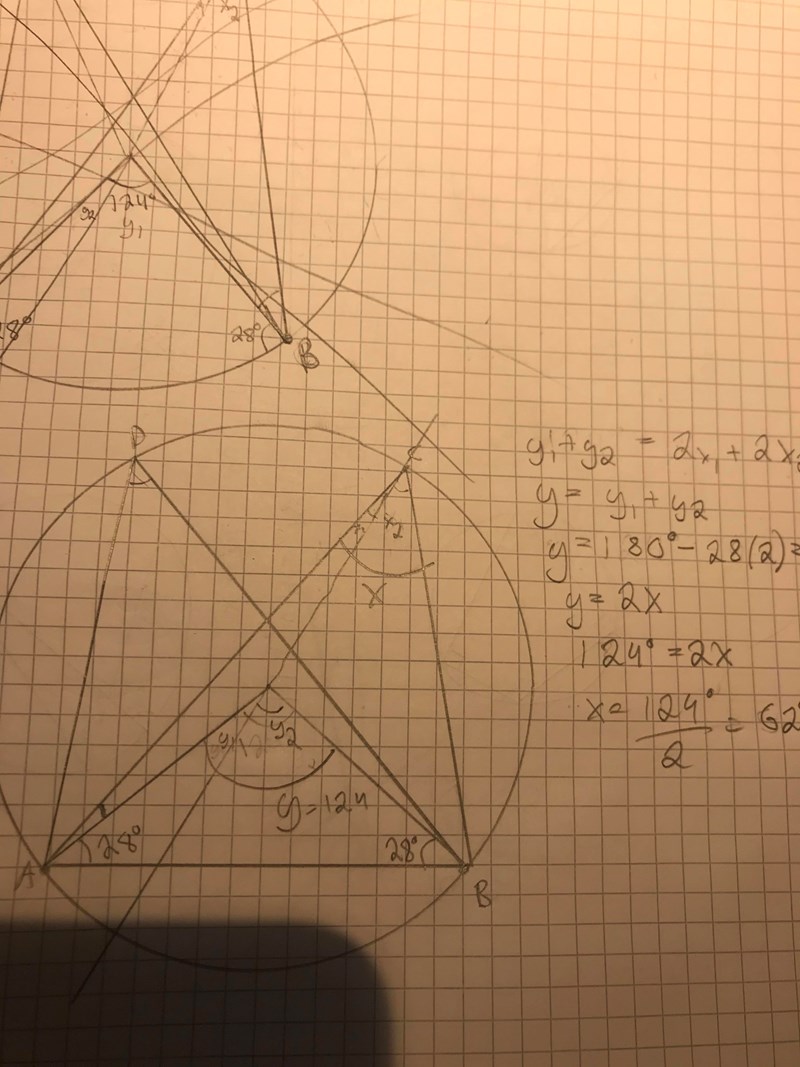 Eftersom vinkel x1 och den andra vinkeln till triangeln är liksidig, så är resterande del 2(x1) för y1. Detsamma gäller för vinkel x2. Det här leder till att vinkel x = (124/2) = 62 grader. Det går självklart att göra mycket utförligare härledningar och beräkningar, men den här funkar för mig och jag har fått vidare förståelse för problemets kärna.