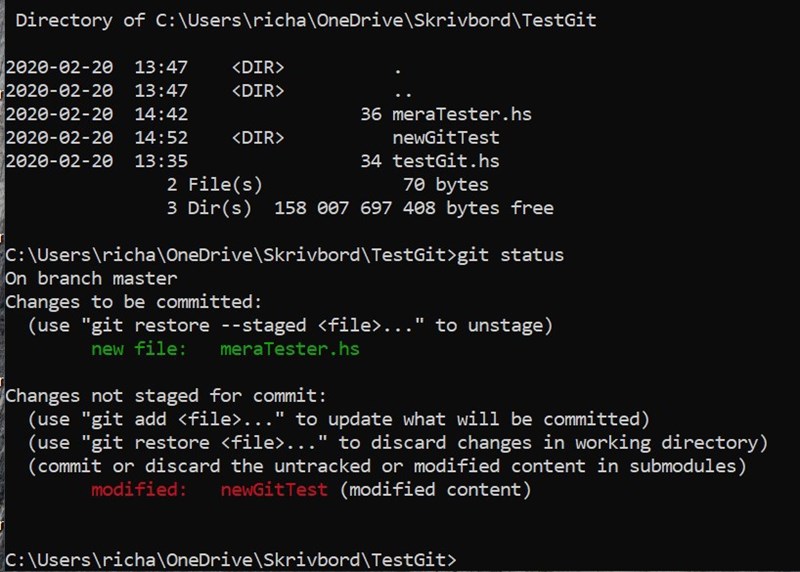 Försöker lära mig github kan inte greppa det. Jag har skapat ett projekt på github som jag har döpt till newGitTest och jag har skapat en mapp på mitt skrivbord som heter testGit. i mappen finns 2 haskell filer. jag vill ladda upp dom här 2 till mitt github projekt "newGittest". Har suttit med olika youtube tutorials videos och trasslat in mig i massa komandon. När jag skriver: git status