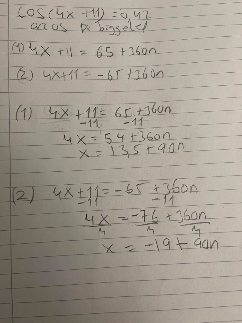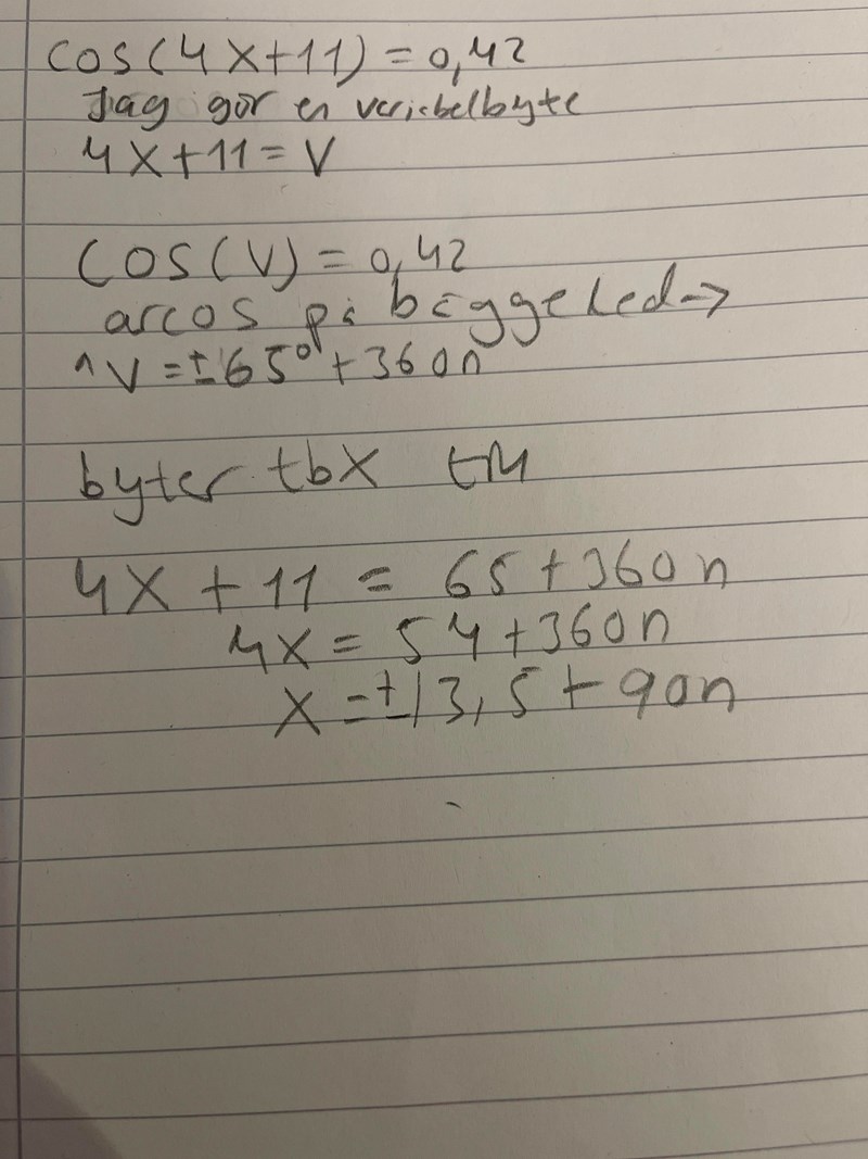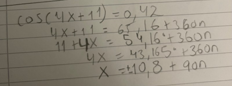 Ekvationen är cos(4x+11)=0,42\cos(4x+11) = 0,42.