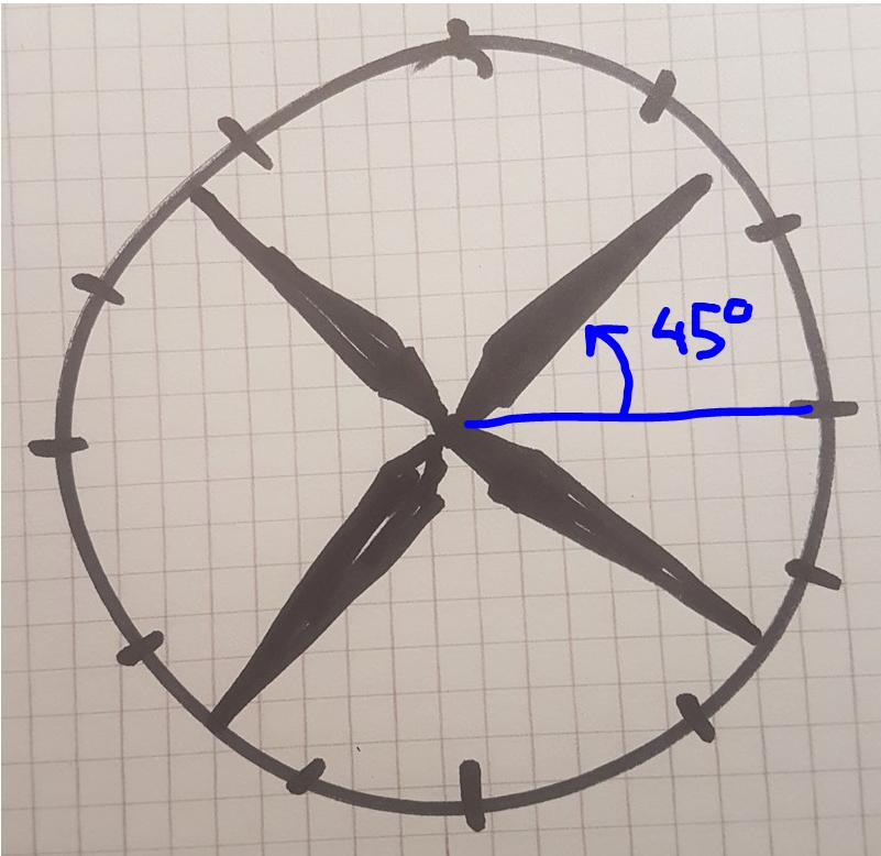 Jag menar att det är 90 grader mellan vinkeln 45 grader och -45 grader. Det är 90 grader mellan vinkeln 90 och 180 grader