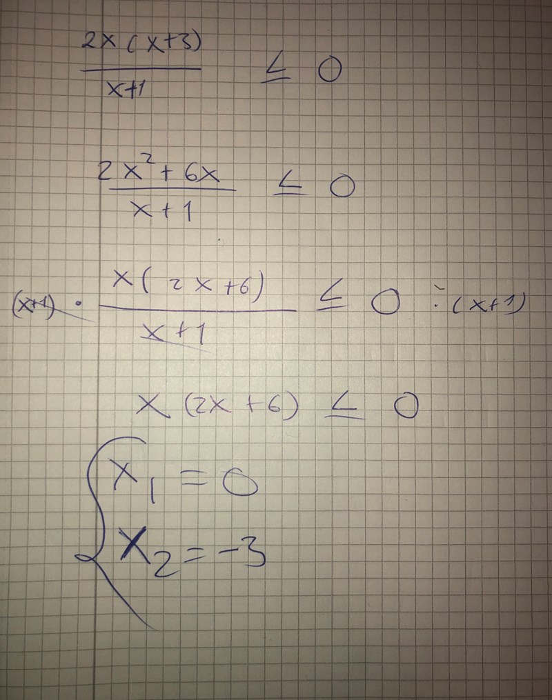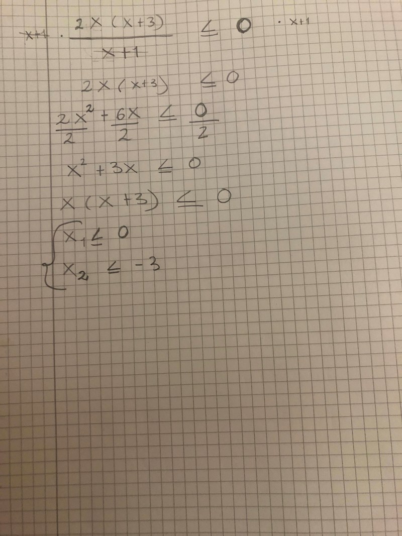 Nja, färdig är du inte riktigt men du är väl på rätt spår. Jag hade inte rört täljaren eftersom den är faktoriserad och enkelt att jobba med. Det första du kan notera är vad händer om x= -1? Sedan måste du ta fram intervallet, dvs i vilka intervall är olikheten sann? Du kan läsa om detta här. Kommer du vidare? :)