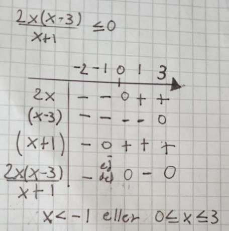 Precis som jag sa i mina föregående inlägg. Du hittar alla brytpunkter (rötter) för täljaren och nämnaren. Du gör en tabell där du sätter in dina värden. I vårt fall har vi: x = -1, x = 0 och x = 3. Nu kollar vi ett tal mellan dem. mellan 0 och 3 kan vi ta värdet 1. eftersom vi inte kan ta -1 för det är ej definerat tar vi nästa värde därpå för att se vad som händer för tal mindre än 0. Vi tar därefter ett tal större än 3, till exempel 4. Nu skriver vi upp alla våra faktorer och sedan hela funktionen i sig. Vi stoppar nu in alla värdet individuellt i alla faktorer och anteckanr om det är ett positivt eller negativt tal (se tabell). Blir det noll markerar vi det med en nolla. nu summerar vi alla tecken, 3 minus blir minus eftersom 2 minus blir + och +- är minus. vi gör detta för alla våra värden och kollar på olikheten igen. Alla tal mindre eller lika med noll. Dvs: alla tal som är negativa eller lika med noll. Du har 2 lösningar som är noll redan, nämligen 3 och 0. Du ser utifrån tabellen nu att alla värden mellan 0 inklusive 0 upp till 3 och allt därimellan upfyller ditt villkor. Du ser också att alla tal mindre än -1 uppfyller villkoret men inte -1 eftersom ännu en gång din olikhet är inte definerad för x = -1. Hänger du med?