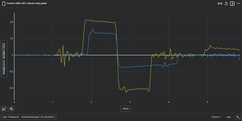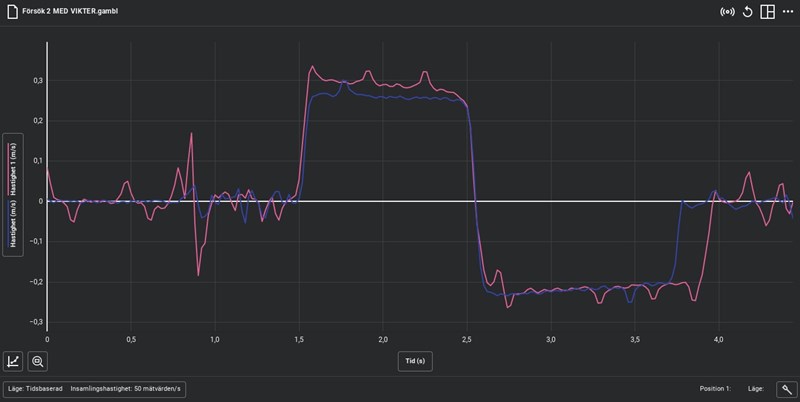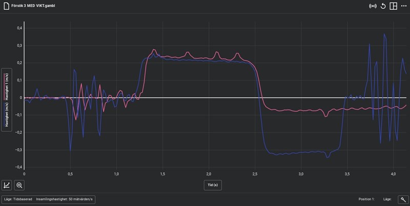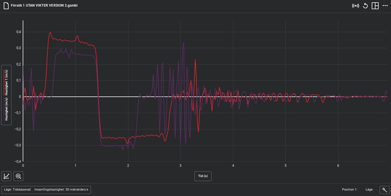 Nedan finns fyra bilder på olika grafer, de följer samma mönster. Jag kan dock inte tyda vad svängningarna betyder? Det är helt enkelt två vagnar på ett rullband som kolliderar.