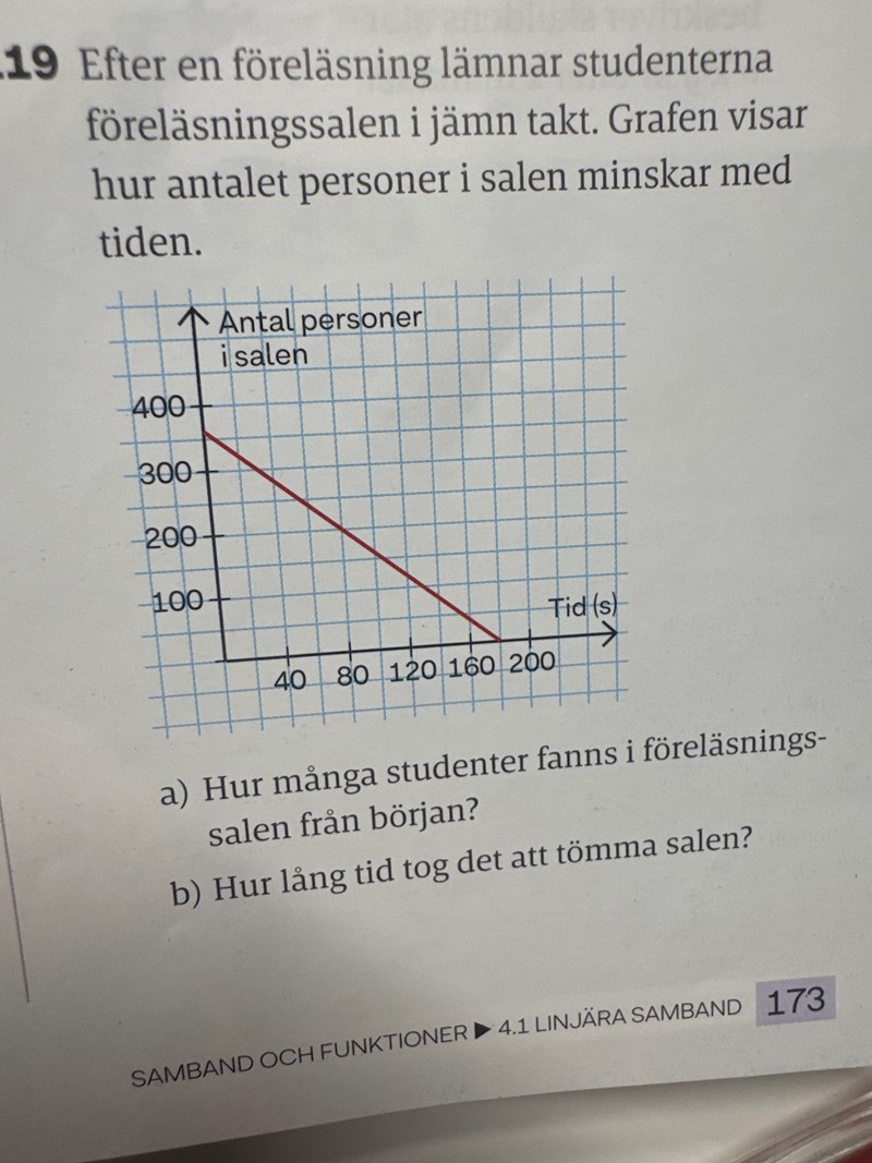 Jag väljer punkterna (80, 200) och (180, 0) för (t, n) i ekvationen n=kt+m.